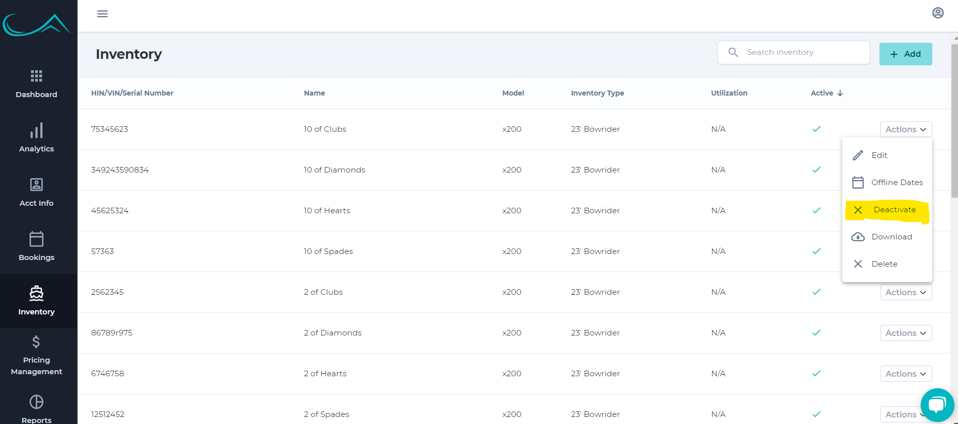 NOTE: make sure if the vessel will be offline for an extended period of time to make sure no existing reservations booked with that vessel will be affected! The system does not randomly reassign or rebook to another vessel if one is taken offline or deactivated!
